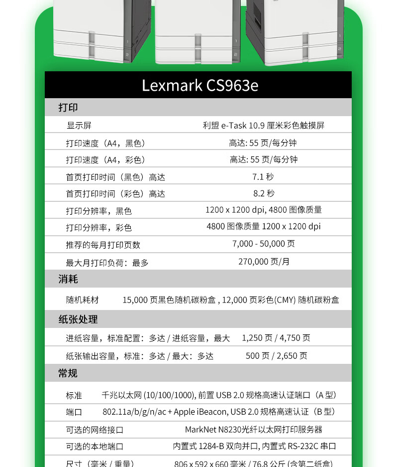 利盟(Lexmark)CS963e彩色激光復印機價格圖片參數 55頁/分鐘 文檔裝訂打印之選