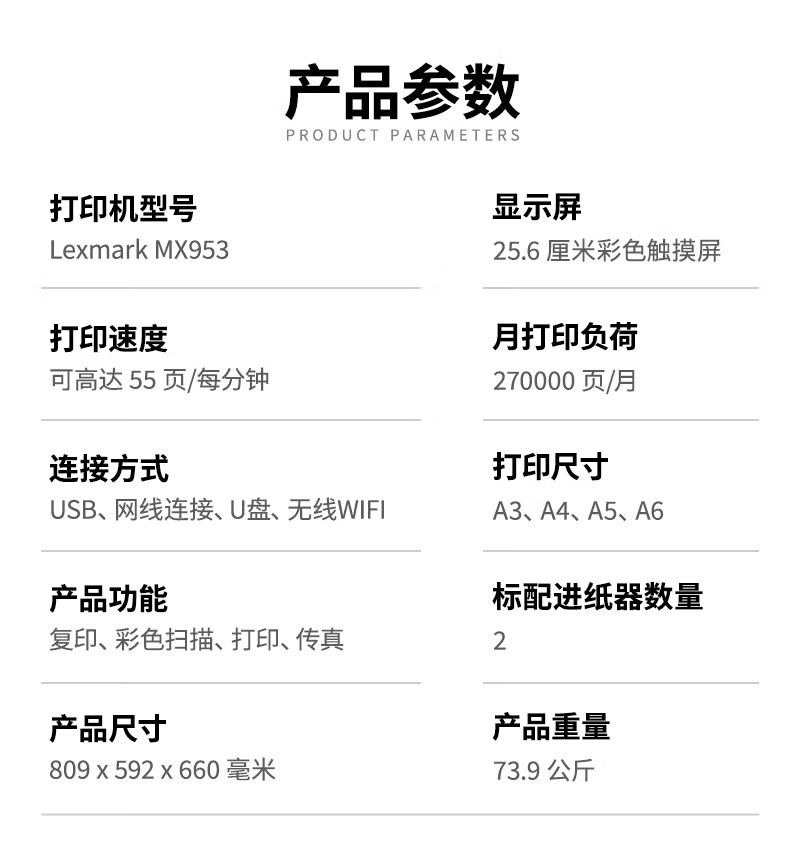 利盟(Lexmark)MX953打印機 A3黑白激光多功能一體打印機價格圖片 55頁/分鐘